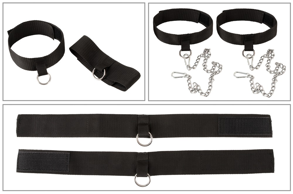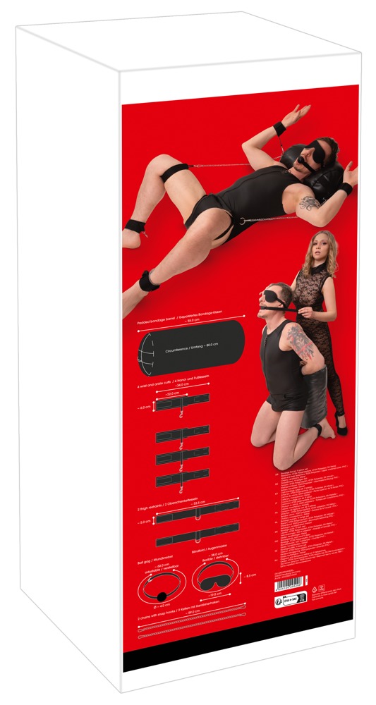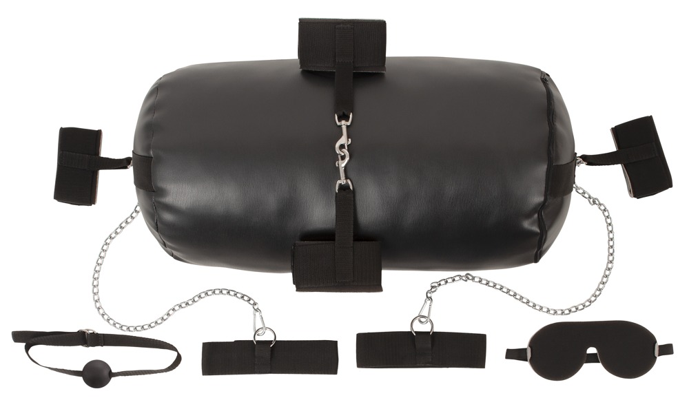 An die beiden D-Ringe der Kissenenden können beiliegende Hand- und Fußfesseln mit ihren Karabinern schnell eingehakt werden. Genauso wie die beiden Oberschenkelfesseln mit den beiden Karabinerketten. Die Fesseln und Riemen sind mit Klettverschlüssen schnell an- und abgelegt, sowie passend verstellbar. Beiliegende weich gepolsterte Augenmaske und der inkludierte Knebel sorgen zusätzlich für fesselnde Spielmöglichkeiten. Beides ist ebenfalls passend verstellbar.