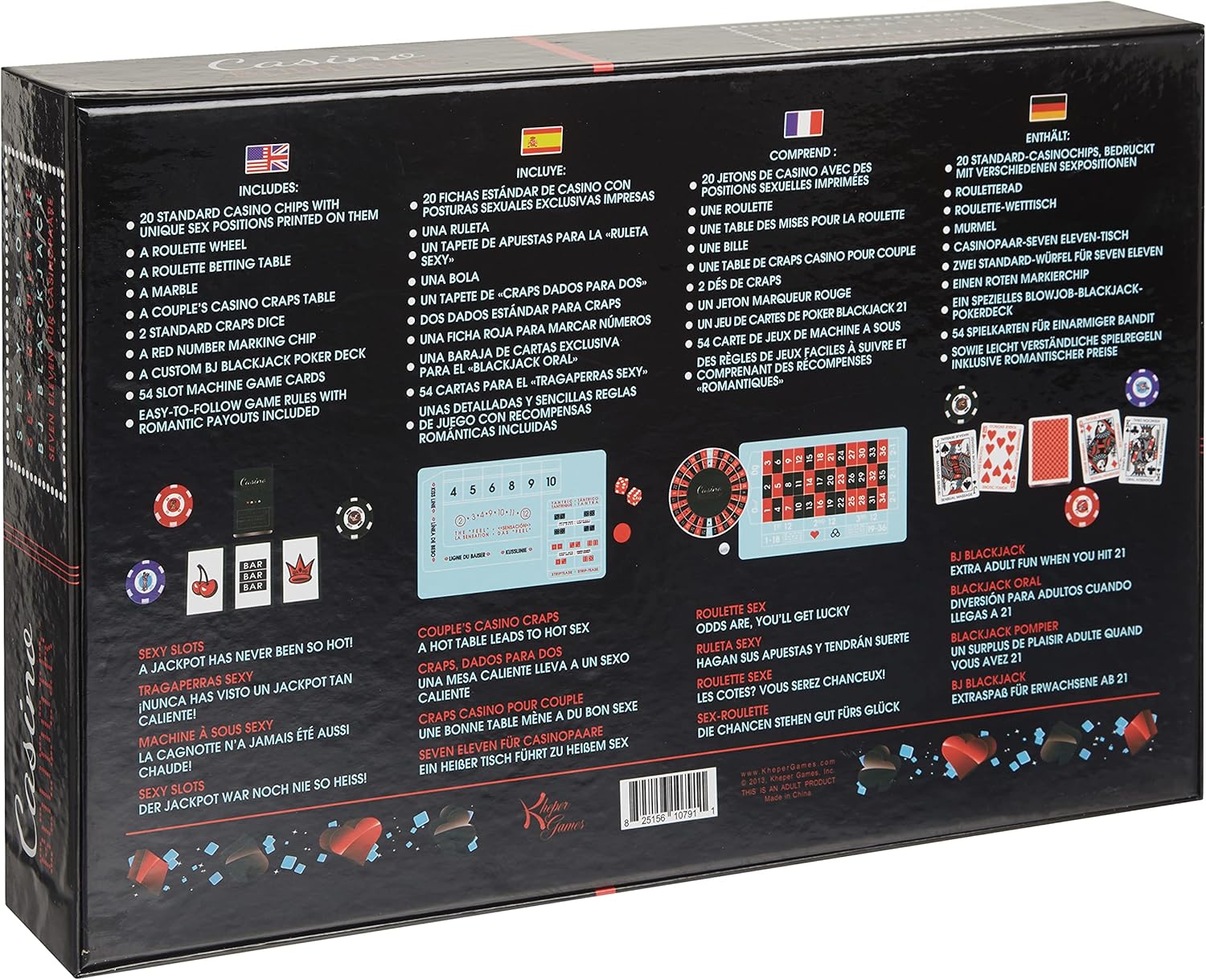 Die Spiele sind dieselben wie beim beliebten Casino-Roulette, Craps, Blackjack und Spielautomaten, aber die Belohnungen sind VIEL intimer. Verdienen Sie sich während des Spiels sinnliche und sexuelle Belohnungen und lösen Sie Ihre Chips am Ende des Spiels für Ihre Lieblings-Sexstellungen ein, die direkt auf die Chips gedruckt sind. Viva LUST Vegas. Inhalt: 20 Standard-Casino-Chips mit aufgedruckten einzigartigen Sexstellungen, 1 Roulette-Rad, 1 Roulette-Wetttisch, 1 Murmel, 1 Casino-Craps-Tisch für Paare, 2 Standard-Craps-Würfel, 1 roter Zahlenmarkierchip, 1 individuelles BJ-Blackjack-Pokerdeck, 54 Spielautomatenkarten und leicht verständliche Spielregeln.