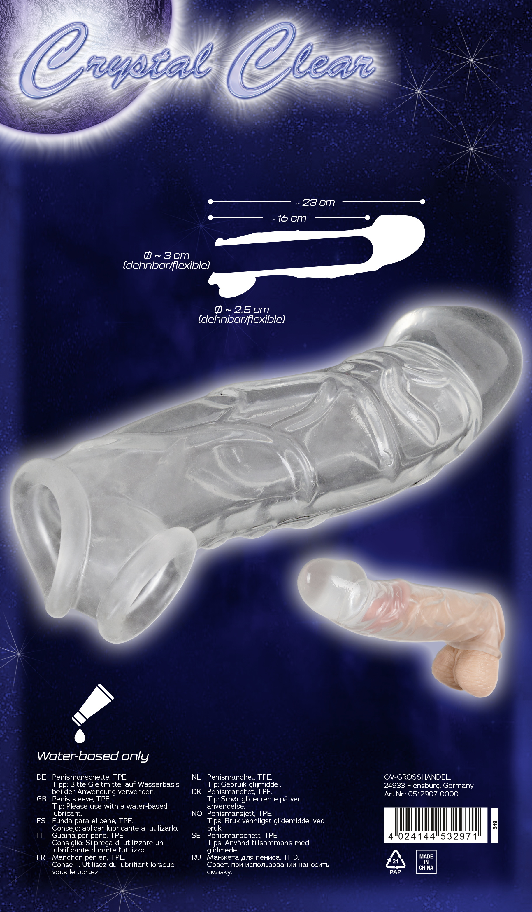 Die innen glatte Penis Sleeve wird einfach über das Glied gestreift und sorgt dank Hodenmanschette für festen angenehmen Sitz ohne Abrutschen. Dabei ist ein Gleitmittel (nicht beiliegend) empfehlenswert. Die eng sitzende Penis Sleeve unterstützt zudem effektiv seine Erektion und die Hodenmanschette sorgt für einen aufregenden Zug und ein zupackendes Gefühl.