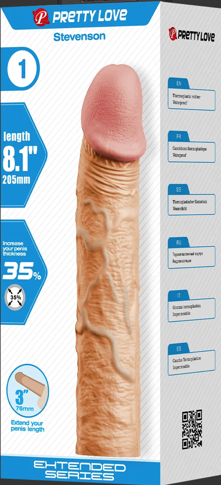 Verlängere Deine Lust – realistisch & intensiv!Mit der Stevenson Penishülle von Pretty Love bringst Du frischen Schwung in Euer Liebesspiel. Diese naturgetreue Hülle ist aus ultra realistischem TPE gefertigt und bietet Dir eine Penisverlängerung von 7,6 cm – ideal für intensive Höhepunkte mit Extra-Feeling! Der anatomisch geformte Schaft mit bauchiger Spitze und fühlbarer Aderstruktur sorgt für realistische Empfindungen beim Eindringen, während sich der glatte Innenkanal eng um Deine Erektion legt und jede Bewegung intensiviert. Mit einer Gesamtlänge von 20,5 cm und einem Durchmesser von 4,4 cm erlebst Du prickelnde Momente voller Power.