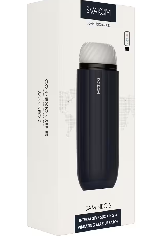 Vollautomatischer und interaktiver Masturbator Sam Neo 2 von Svakom mit Vibration und jetzt noch stärkerer kontrahierender Saugfunktion. Dazu die raffinierte Extended O‘ Funktion zur Verlängerung des Höhepunktes. Für individuelle intensive Blowjobs bequem per App – einfach zurücklehnen und genießen!