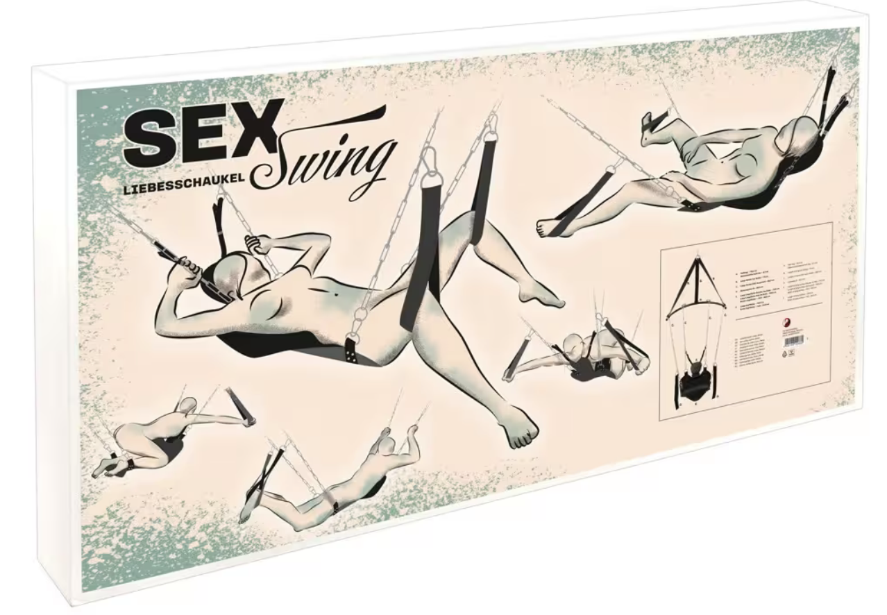 Liebesschaukel Sex Swing von You2Toys, die mit stabilen Ketten (je 92 cm lang) an dem 2,7 cm starken Halbring und dann an reißfesten Bändern (je 73 cm lang) an der Zimmerdecke angebracht wird. Sie lässt sich in der Höhe/Länge individuell einstellen. Perfekt für unterschiedlich große Partner!