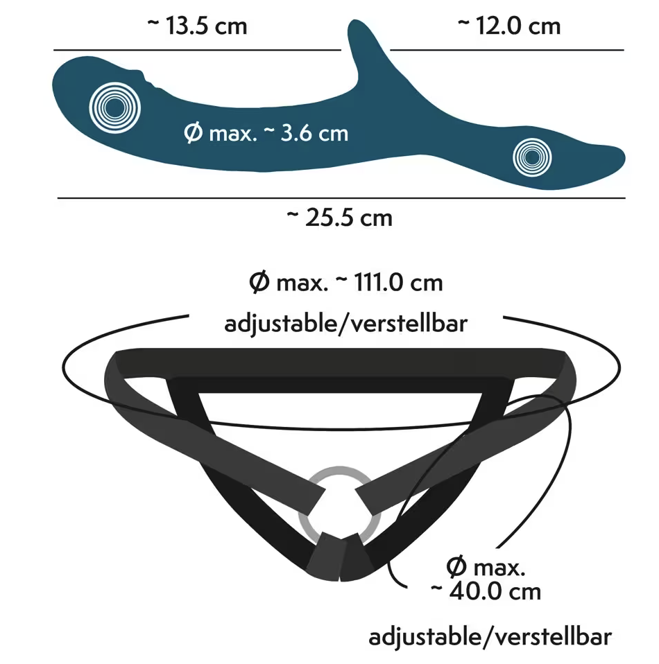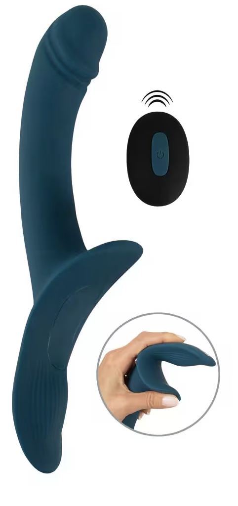Der raffinierte Vibrator punktet mit seinen doppelmotorigen Vibrationen, die den aktiven und passiven Part zugleich verwöhnen. Der aktive Part genießt den anatomisch perfekt geformten Aufleger, der sich vibrierend an Vulva und Klitoris schmiegt. Der passive Part den ideal gebogenen Vibrator-Schaft mit der strukturierten Eichel. 7 Vibrationsmodi sind direkt am Toy oder – noch bequemer – mit der Fernbedienung steuerbar (Reichweite 8 m). Der Vibrator ist leicht aus dem Fixier-Ring des Umschnallgurtes herausnehmbar.