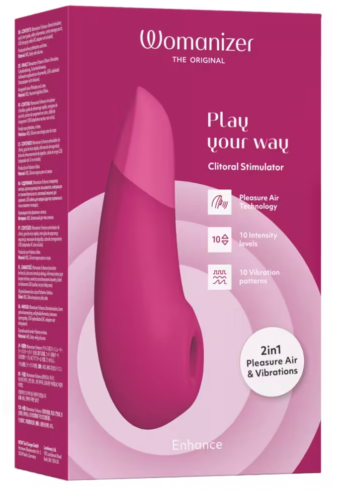 Der ergonomische und handliche ENHANCE von Womanizer begeistert mit der neuen einzigartigen Kombination aus Pleasure-Air-Technologie und ultrastarker We-Vibe-Vibration. Pulsierende Druckwellen verwöhnen berührungslos die Klitoris, während die tiefen kraftvollen Vibro-Schwingungen sich über die gesamte Vulva ausbreiten. Da kommt der Höhepunkt schnell und zuverlässig – Orgasmen für alle!